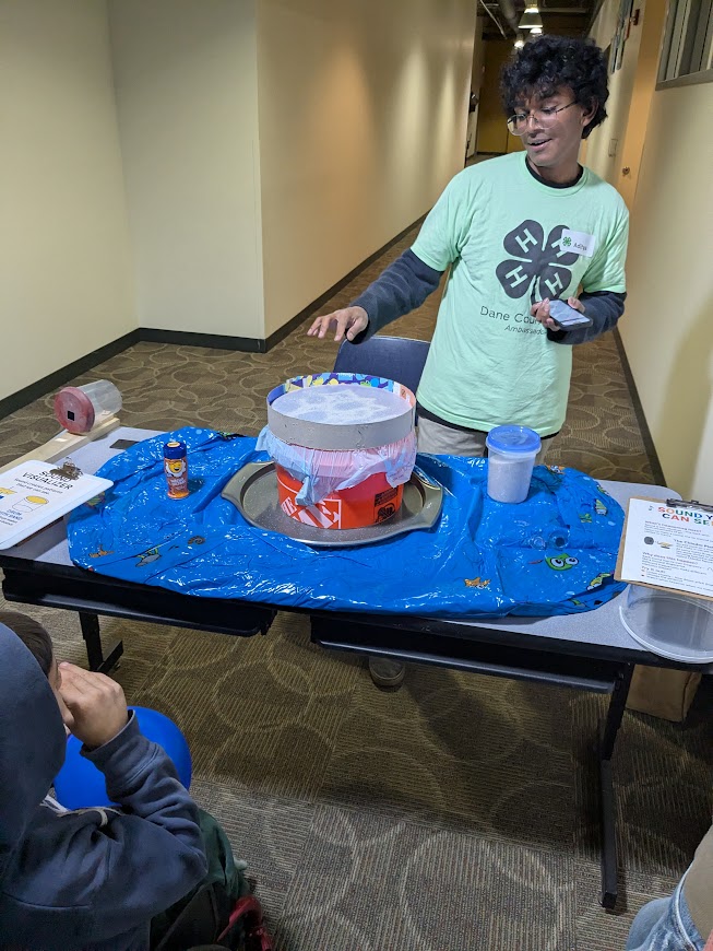 The theme this year, inspired by the Wisconsin Science Festival, was Rock & Roll: Music, Motion & Geology, and the activities were as lively as the name suggests. Youth-led stations included laughing cups, squealing sticks, screaming balloons, and oscilloscopes and a Chladni plate made with household items. There was even an interactive Theremin demonstration that let youth play music without touching a single string or key.