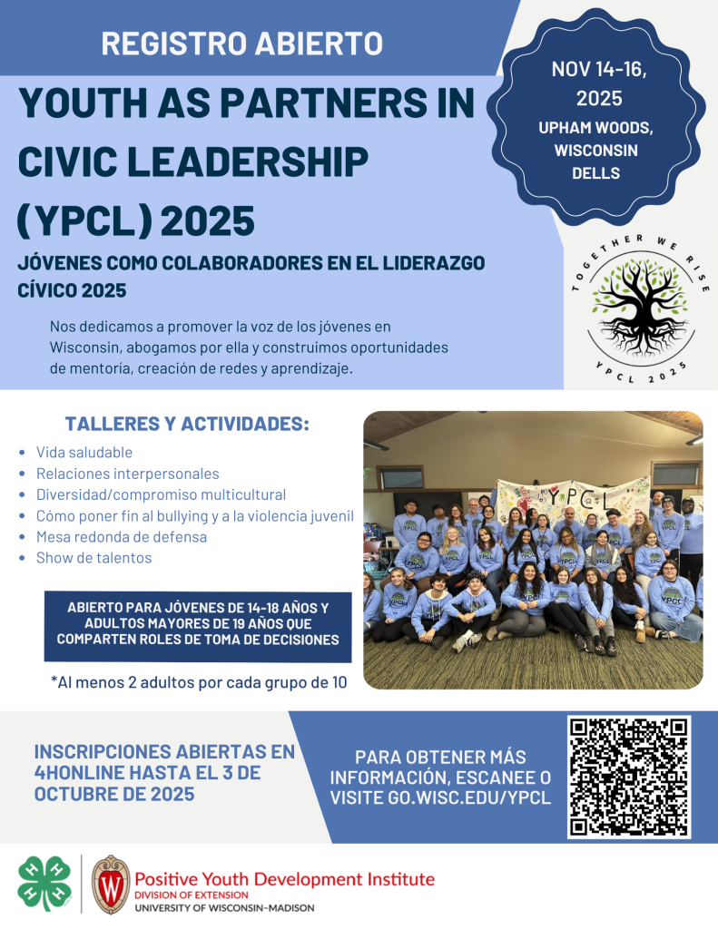 La misión de la Conferencia Jóvenes como colaboradores en el liderazgo cívico (YPCL) es promover la voz juvenil en Wisconsin aumentando la capacidad para que los jóvenes y adultos compartan el liderazgo cívico en comunidades locales, escuelas y organizaciones. Abogamos por una voz juvenil y construimos oportunidades de mentoría, creación de redes y aprendizaje.